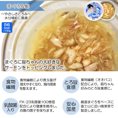 | 原材料 | まぐろ、鮭、まぐろエキス、食物繊維(オオバコ)、かつお節、かつお骨粉末、オリゴ糖、 コラーゲンペプチド、乳酸菌(加熱処理)、増粘安定剤(キサンタンガム)、ビタミンE |