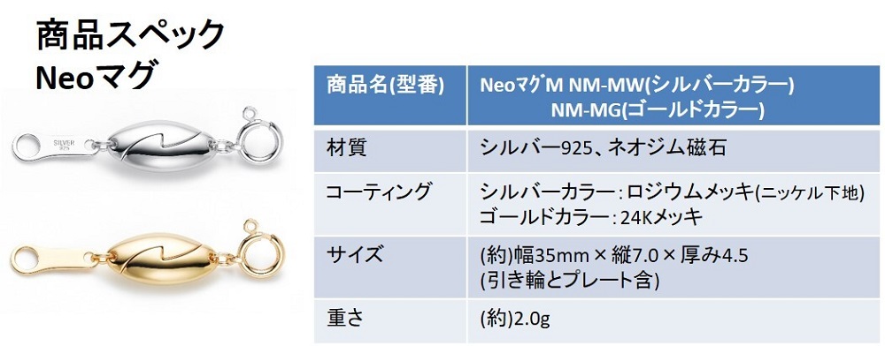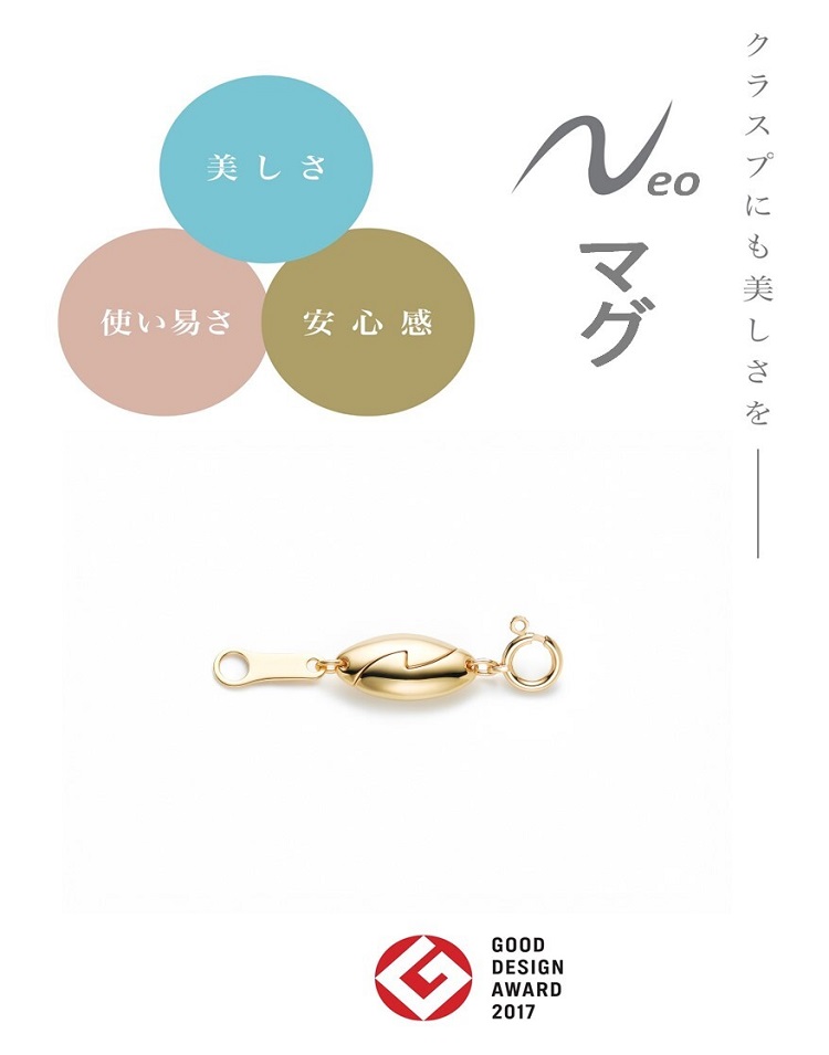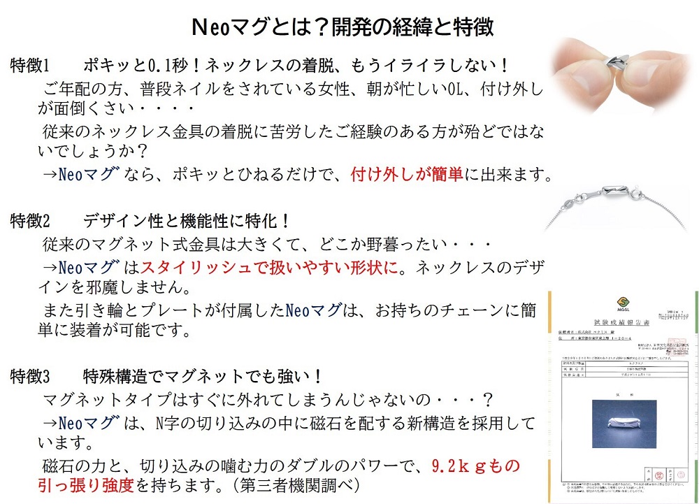 引き輪とプレートが付いた「Neoマグ」はお手持ちのネックレスに装着し自ら取り外すことも可能です。扱いやすさサイズ感を両取り。